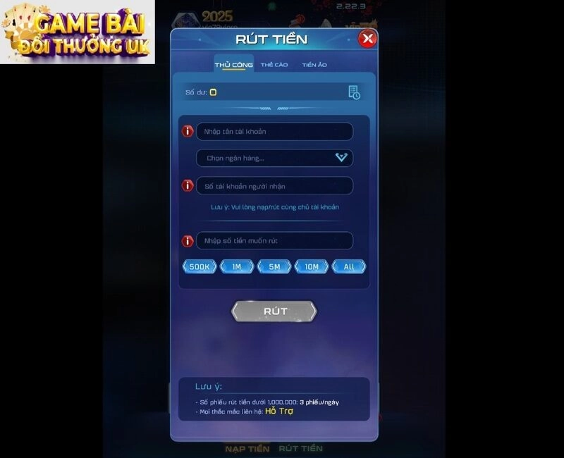 Phương thức thủ công cho phép rút tiền VIP79 qua ngân hàng, đảm bảo an toàn tuyệt đối, với yêu cầu tài khoản rút và nạp phải cùng chủ sở hữu. Nếu rút dưới 1 triệu VNĐ, bạn được hỗ trợ rút tối đa 3 lần/ngày, phù hợp cho người chơi mới.